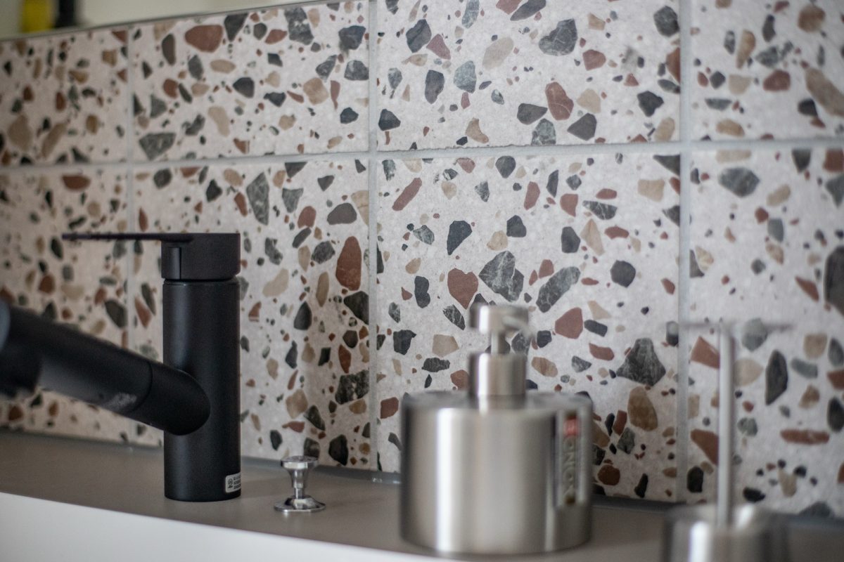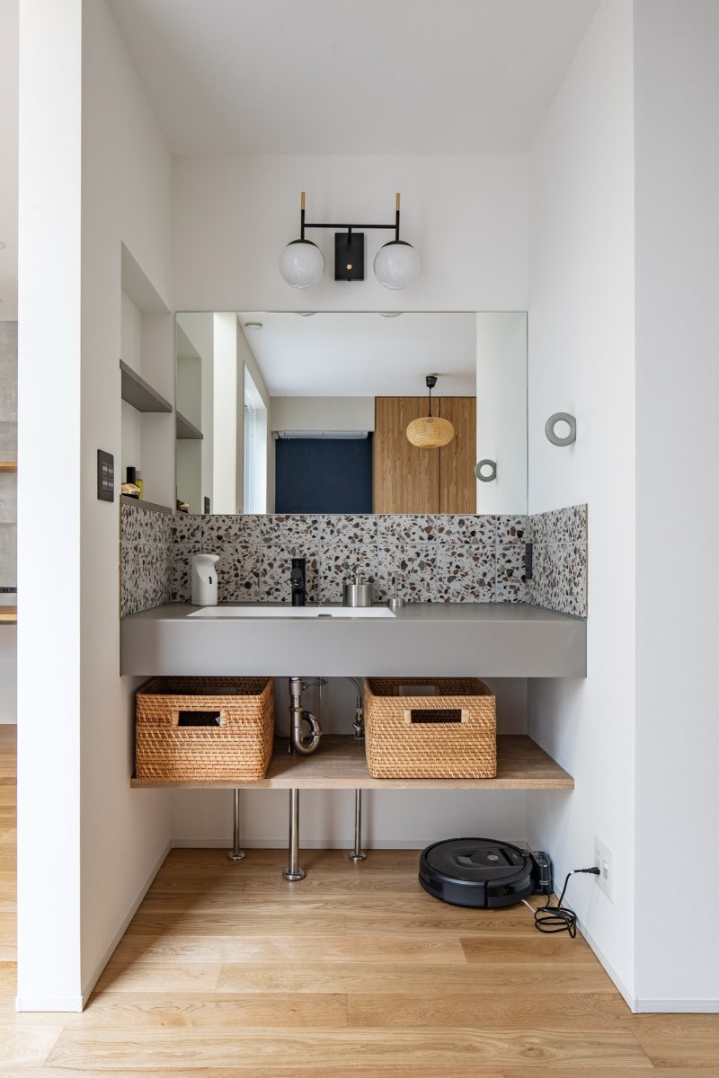 たとえば、洗面スペースに用いられたのは遊び心ある柄のタイルと、すっきりとしたグレーカウンター。照明やミラーの配置まで丁寧に設計し、単なる洗面ではなく「暮らしの一部として気分が上がる場所」に仕立てました。