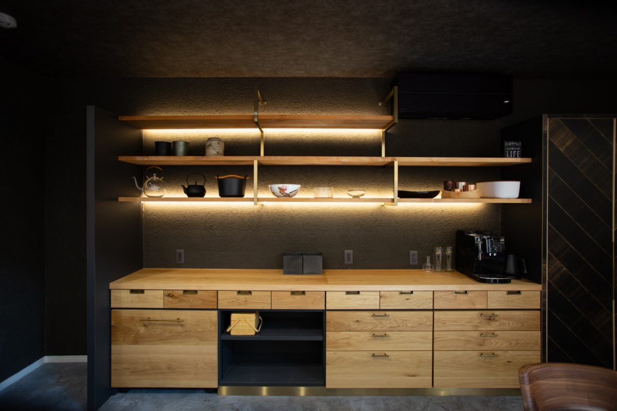 また、造作のキッチンカップボードでは、節や木目の表情が豊かな無垢材を使用。背面の塗り壁とライン照明の組み合わせが、上質なレストランのような雰囲気を醸し出します。