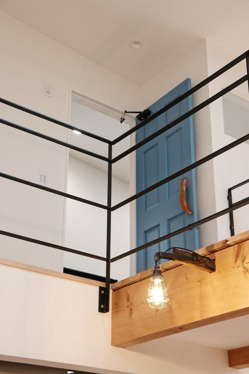 さらに、こだわりのブラケットライトと、2階のブルーのドアに取り付けられた、木製の波打つような取手。遊び心とクラフト感のあるディテールが、家への愛着を育てます。