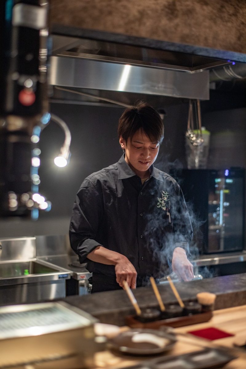 黒と木目を基調としたシックな空間は、重厚感と落ち着きを併せ持ち、まさに“大切な人と行きたくなる店”を体現。カウンター席にはあえてダクトを見せず、格子状の天井を設けて吸排気機能を美しく包み込みました。空間の一体感を損なうことなく、視線の抜けと上質な陰影を演出しています。